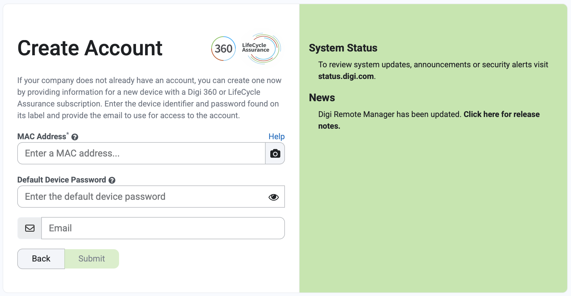 If you have not yet created your Digi Remote Manager account, then this process will guide you through the steps to create one.