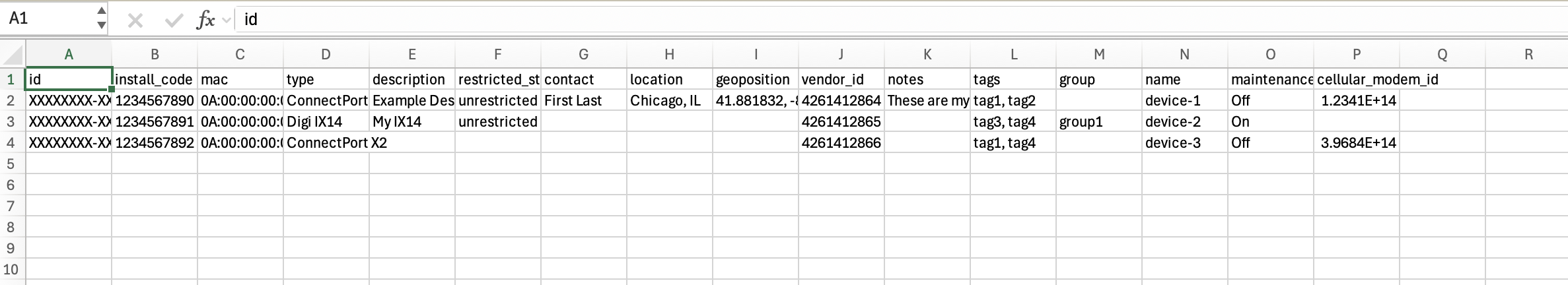 To simplify the device registration process, you can download the example CSV file provided for bulk device registration and use it add your own device data. This sample file includes the correct column headers and formatting required by Digi Remote Manager, helping ensure that your data is structured properly before upload.