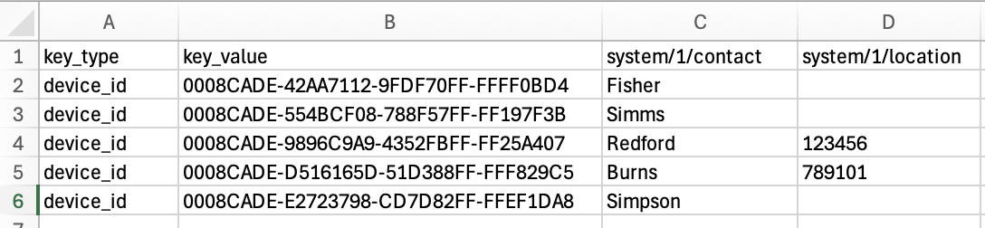 In the Contact column, add the unique Contact value for each device (for example, Fisher, Simms...). In this instance, there would be a unique value in every cell of the Contact column. There would be no empty cells.