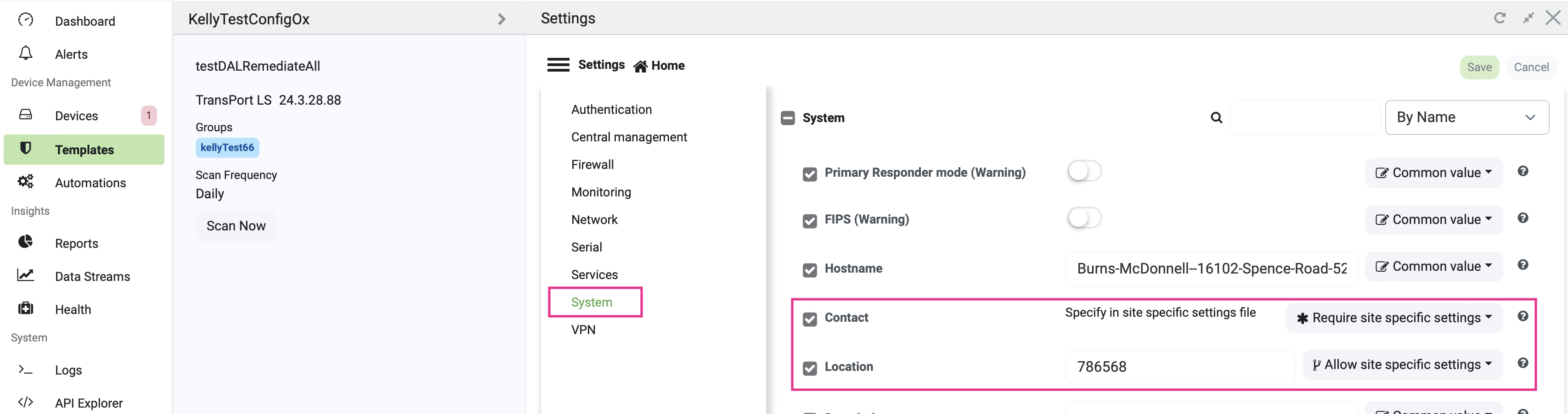 You have gone through all the settings and determined that out of the ones you want controlled by the template, two in the System configuration need to be device specific: Contact and Location.