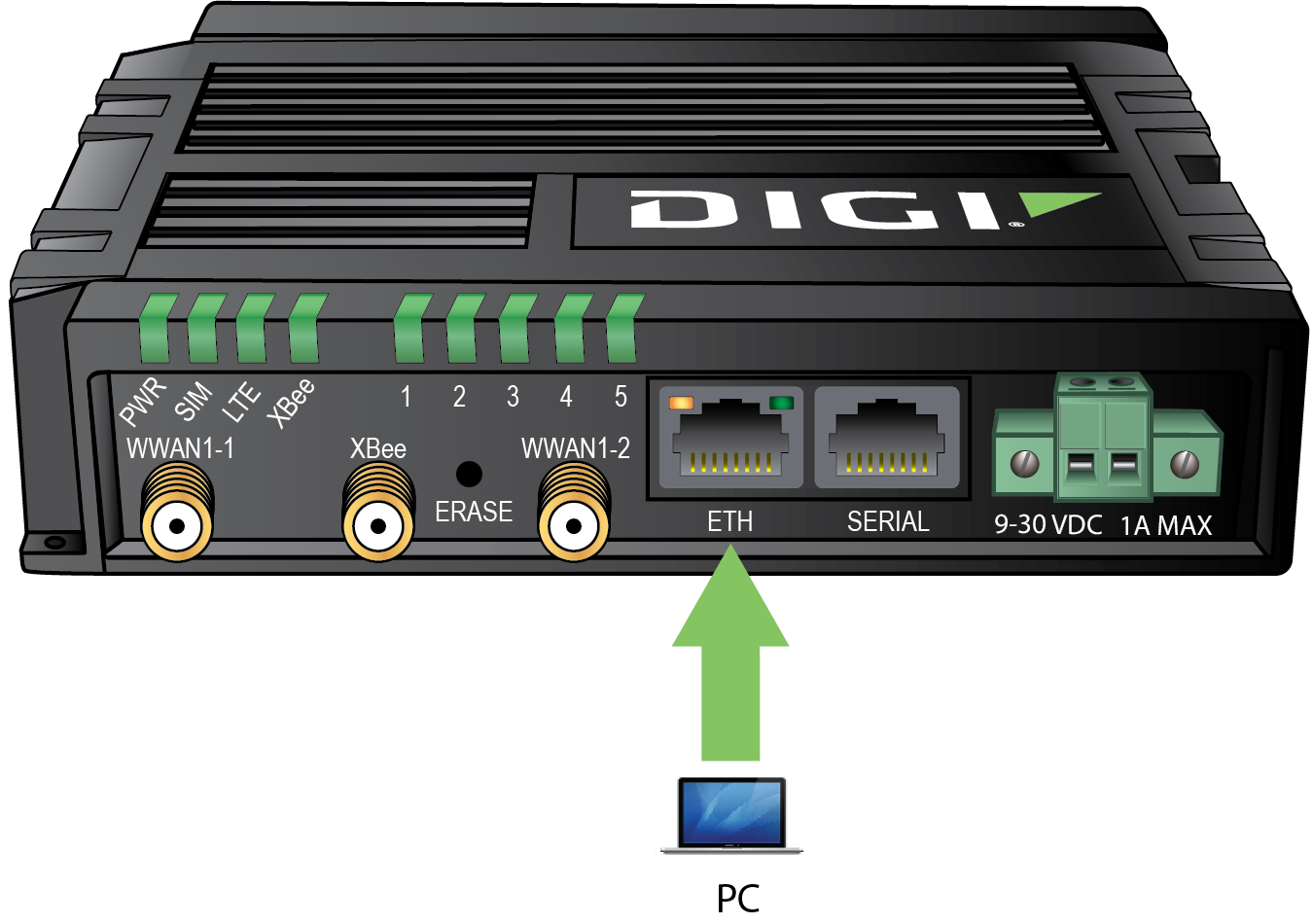 You can also change the configuration of the Ethernet port to WAN, connect the product model to the internet by providing an internet connection to the WAN-configured Ethernet port, and configure the device over Digi Remote Manager. For instructions on configuring the ETH port for WAN, see Configure a Wide Area Network (WAN).