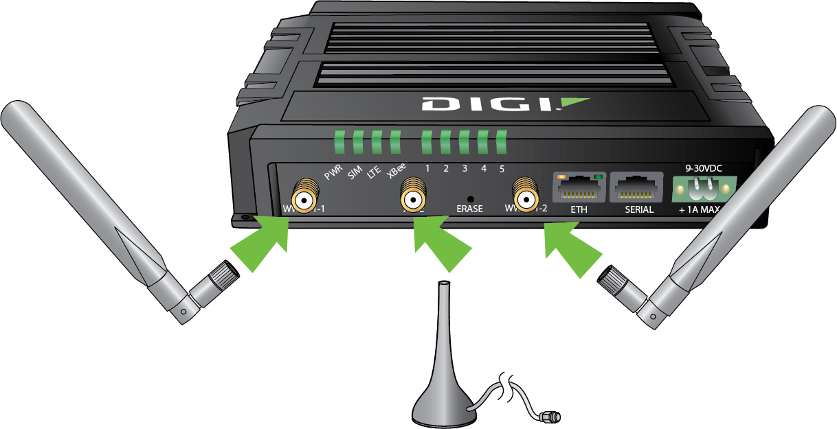 Attach and securely tighten both the cellular antennas and the RF antenna to the WWAN-1, WWAN-2, and XBee connectors on the router.