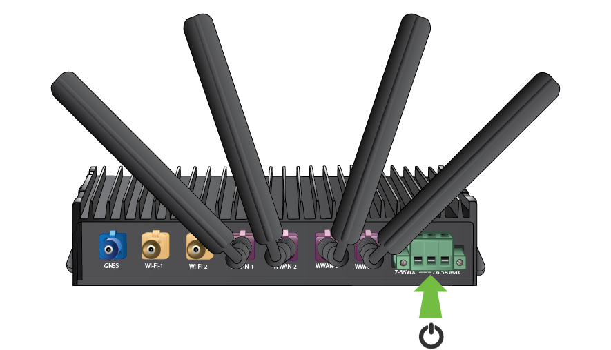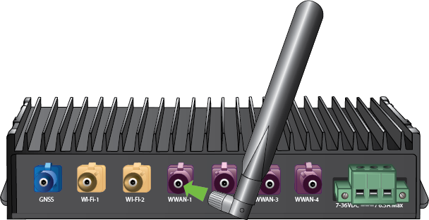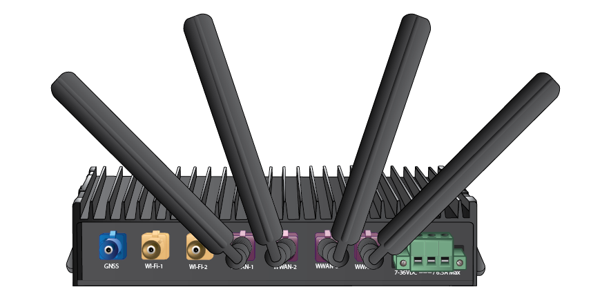 There are four Fakra antennas for a 5G router. Push in each Fakra antenna into the WWAN-1, WWAN-2, WWAN-3, and WWAN-4 connectors.