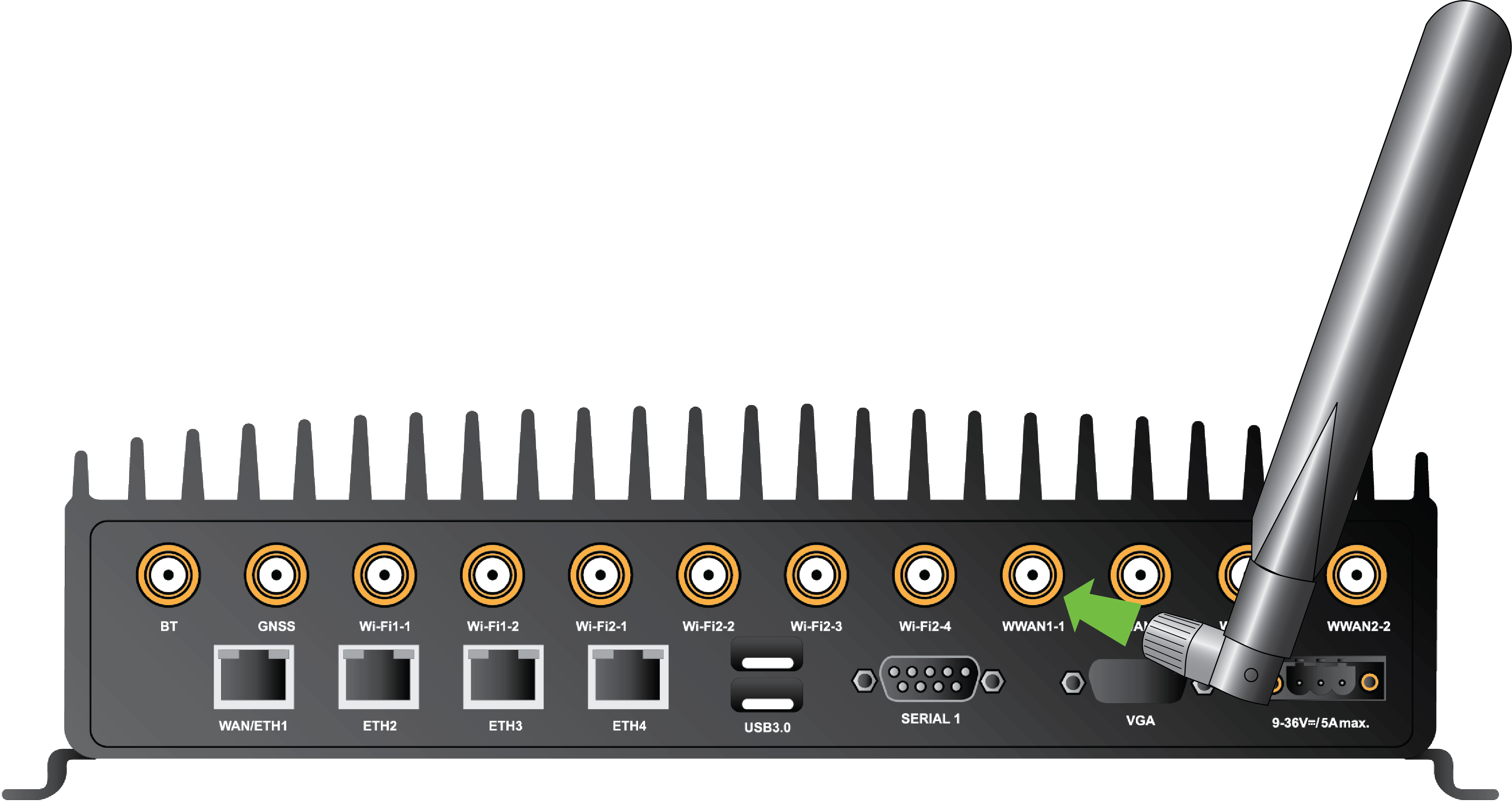 For the single cellular 5G model with four cellular antennas, attach and securely tighten each antenna to the WWAN 1, WWAN 2, WWAN 3, and WWAN 4 connectors.
