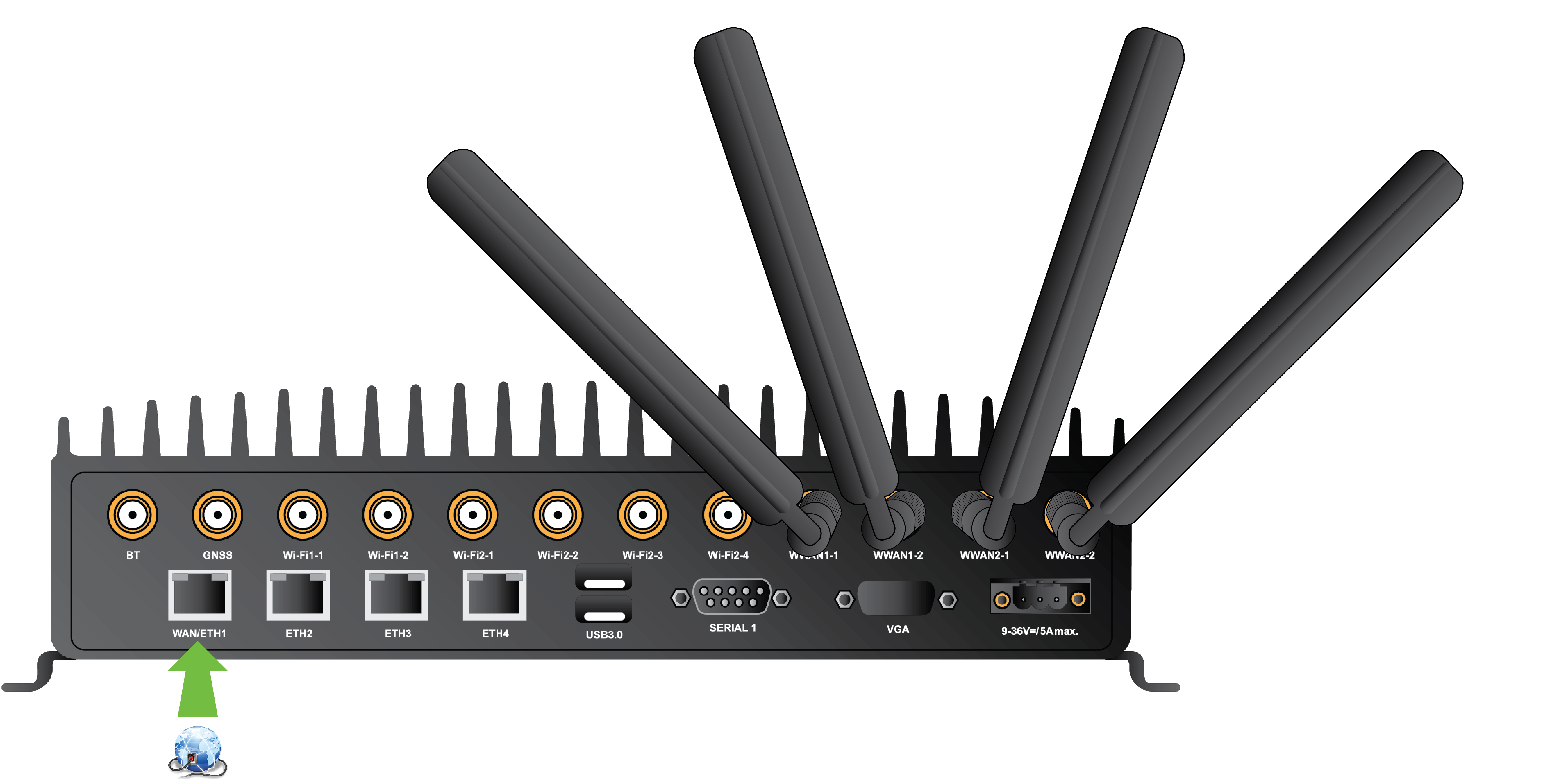 Using an Ethernet cable, connect the TX64's WAN/ETH1 port to the internet, such as an office network or LAN Ethernet port in an office environment.