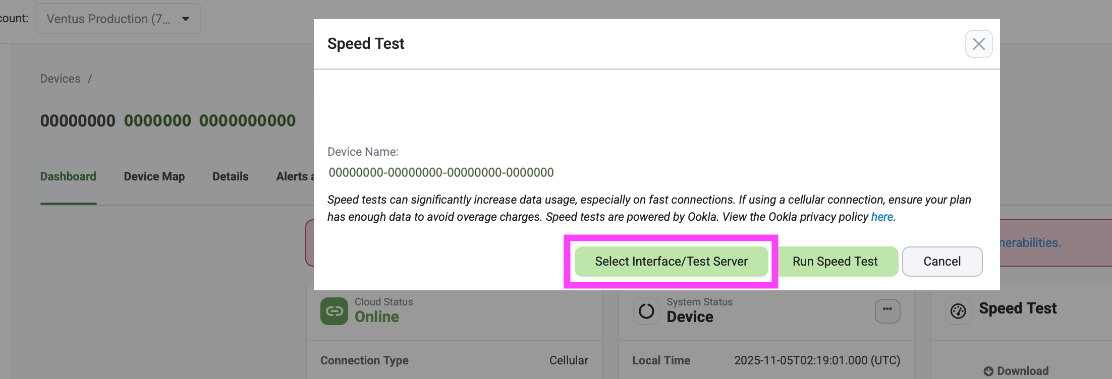 Speed Test improvements: Speed Test now allows selecting the interface to test from and the Ookla server to test against (based on a server list returned by the device).