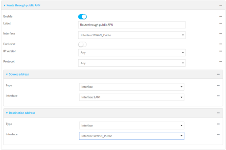 To accomplish this, we will create separate WWAN interfaces that use the same modem but use different APNs, and then use routing roles to forward traffic to the appropriate WWAN interface.