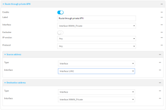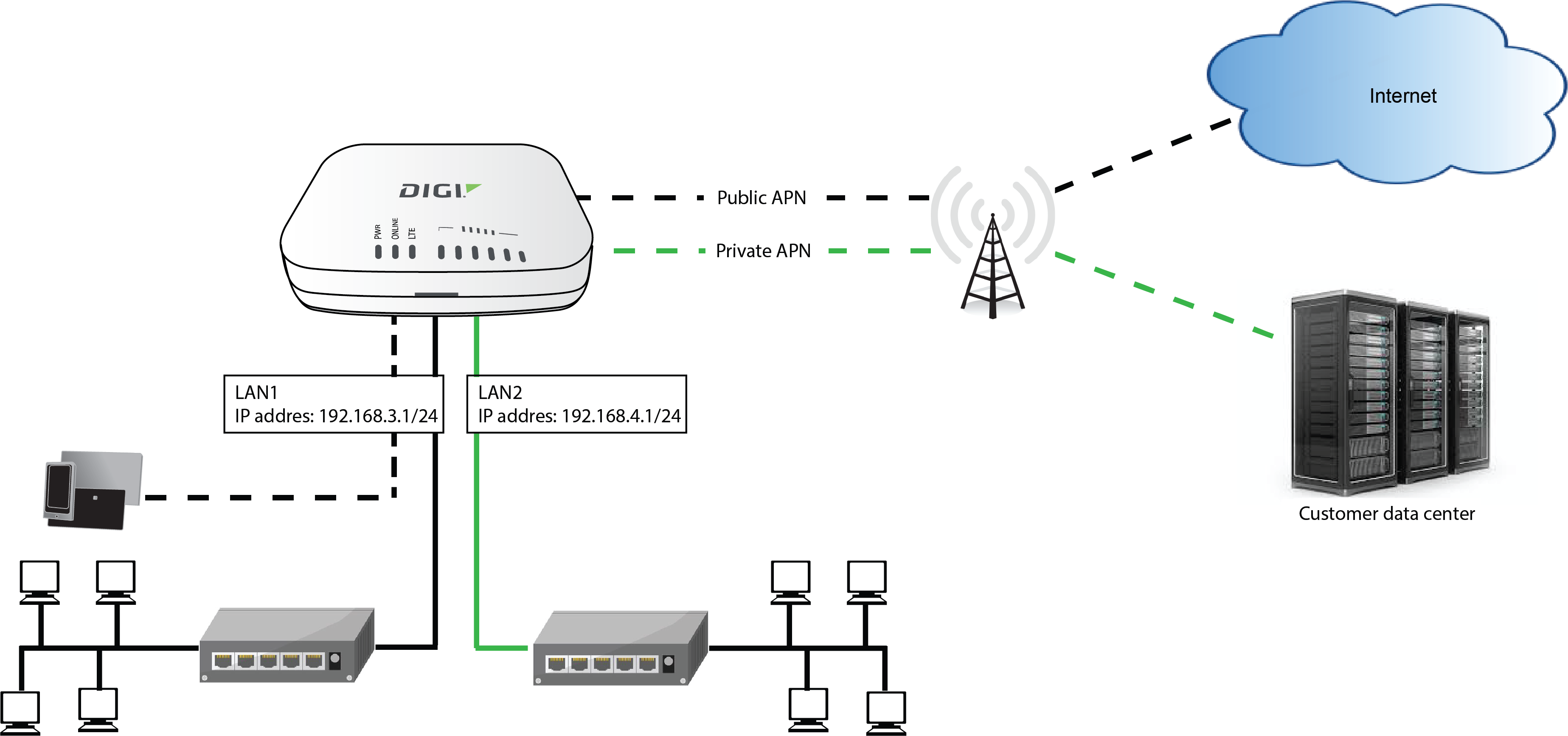 In the following example configuration, all traffic on LAN1 is routed through the public APN to the internet, and all traffic on LAN2 is routed through the private APN to the customer's data center: