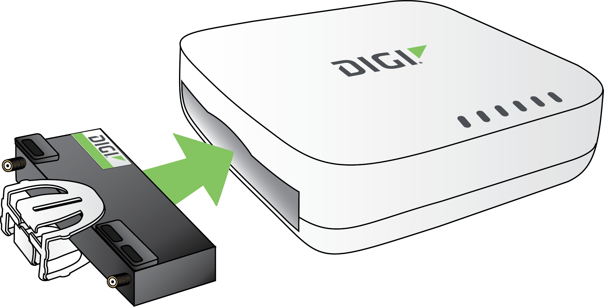 5. With the antennas SMA connectors pointing outward, slide the CORE modem into the EX15 device. A clicking sound will indicate it is properly inserted. Image shows the 1002-CM CORE modem.