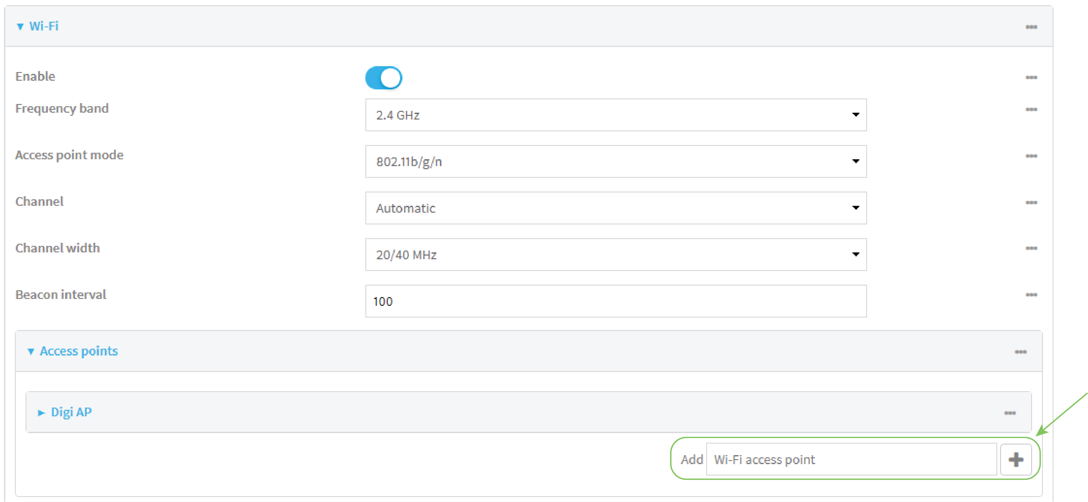 By default, the EX15W device comes with one preconfigured access point, Digi AP. You cannot delete default access points, but you can modify them or you can create your own access points.