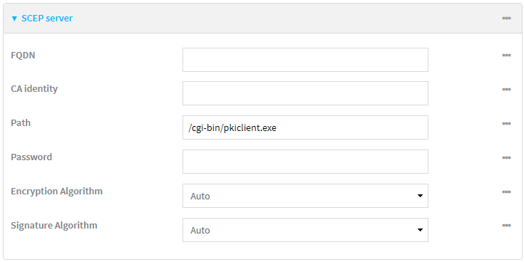 Simple Certificate Enrollment Protocol (SCEP) is a mechanism that allows for large-scale X.509 certificate deployment. You can configure EX50 device to function as a SCEP client that will connect to a SCEP server that is used to sign Certificate Signing Requests (CSRs), provide Certificate Revocation Lists (CRLs), and distribute valid certificates from a Certificate Authority (CA).