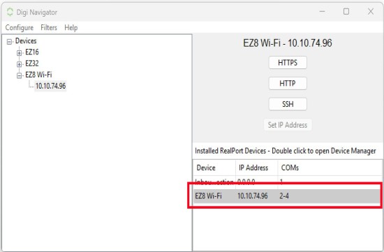 In the RealPort list section of the Digi Navigator, double-click on a name in the Device column.