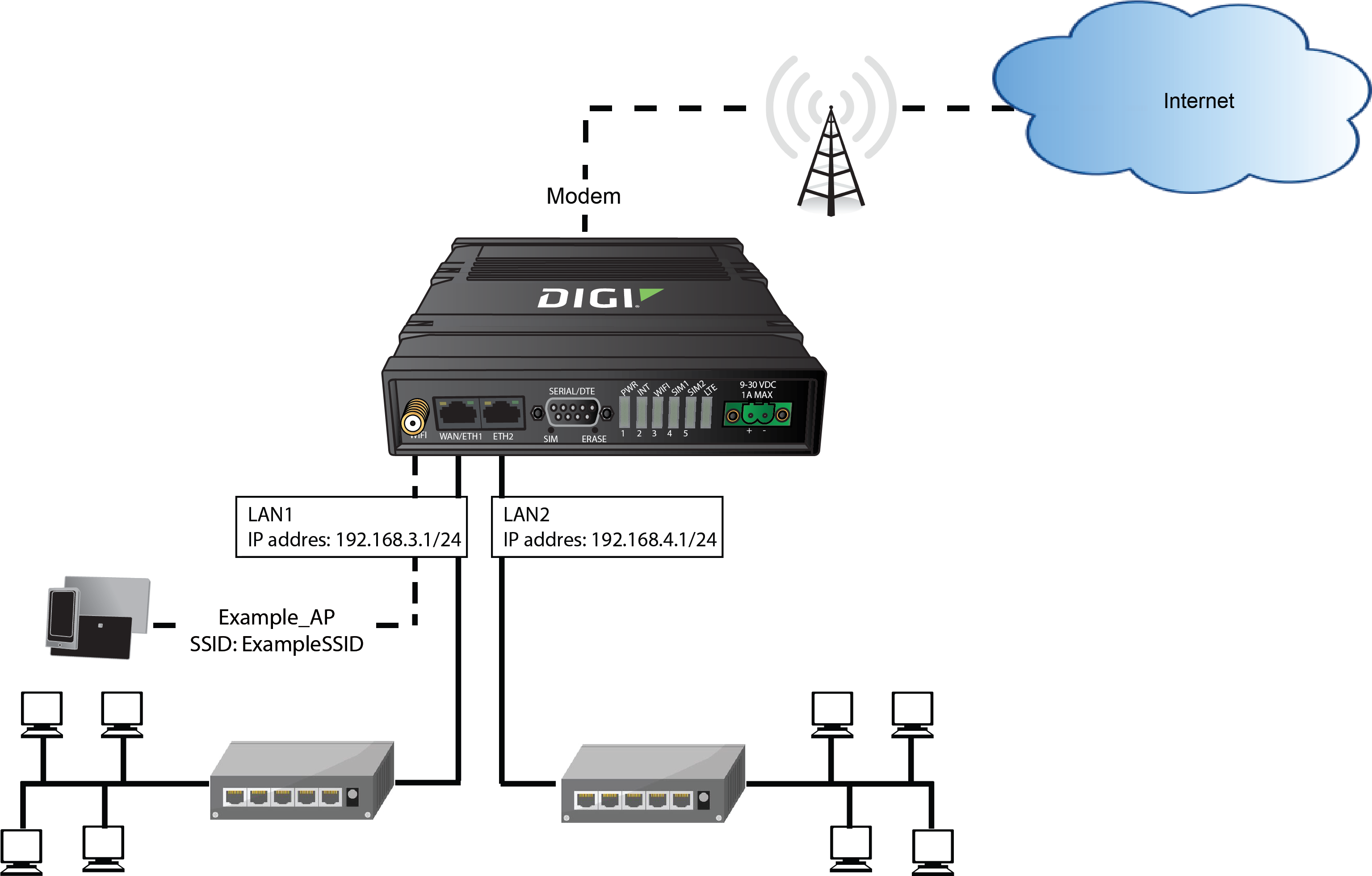 1. Connect a device to LAN1 through the ETH1 Ethernet port, or by connecting to the Example_AP Wi-Fi1 access point.
