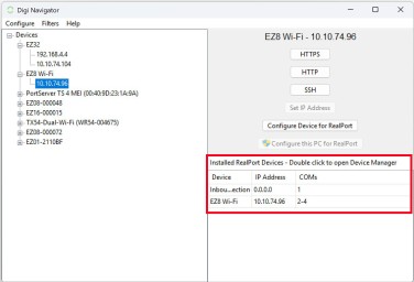 After you have enabled and configured RealPort on at least one Digi device, a list of configured devices displays at the bottom of the Digi Navigator. You can refresh the list and easily access the COM port configuration on your computer.