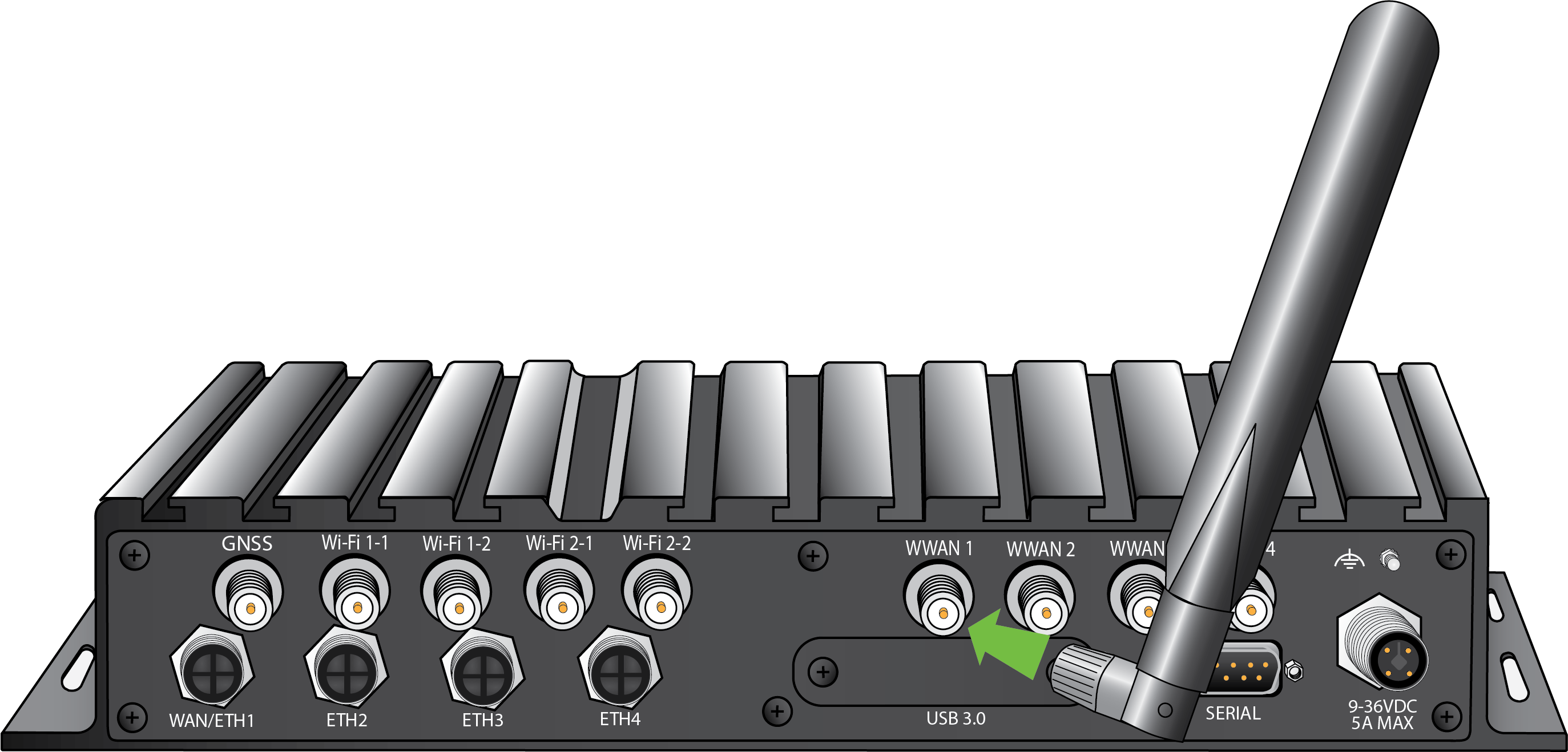 Securely finger-tighten each antenna to the threaded barrel using the nut at the base of the antenna.