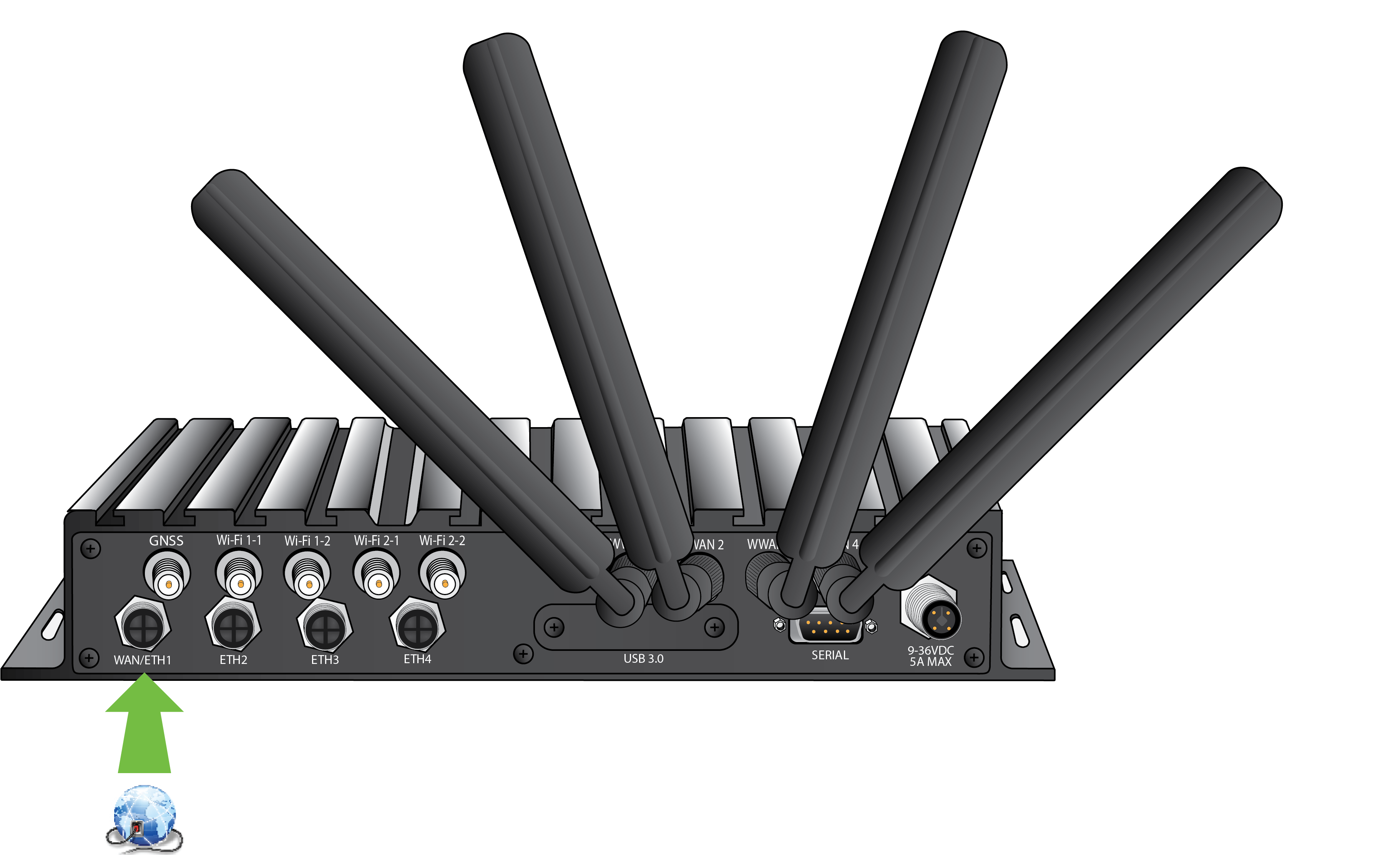 Using an Ethernet cable, connect the TX64-Rail's WAN/ETH1 port to the internet, such as an office network or LAN Ethernet port in an office environment.